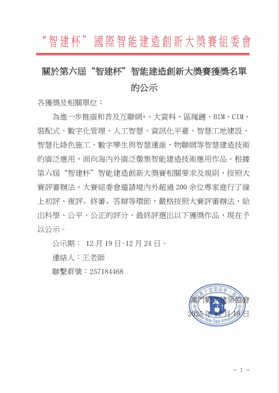 “智建杯”智能建造创新大奖赛是由澳门数字建筑协会、澳门建筑资讯模型协会、粤港澳大湾区城市建筑学会(香港)、香港建筑信息模拟学会等单位主办,旨在大力推广和普及互联网+、大数据、智慧工地建设、BIM、CIM、数位化管理等智慧建造技术的广泛应用,是国际上权威的BIM应用竞技赛事。